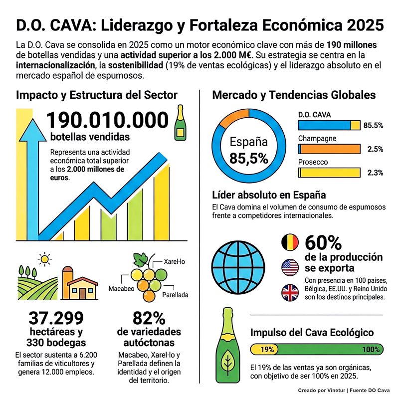 El sector del Cava en 2025 se consolida como un motor económico fundamental con una actividad superior a los 2.000 millones de euros y un volumen de ventas que alcanza los 190.010.000 de botellas. La Denominación de Origen (D.O.) mantiene un liderazgo indiscutible en España, representando el 85,5% del consumo de espumosos de calidad en volumen y el 73,8% en valor.