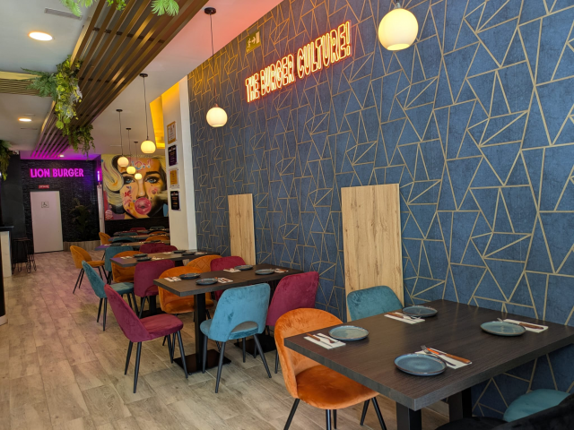 El espacio sorprende desde la entrada por un cuidado en los detalles poco habitual dentro de este segmento. Lejos de la estética asociada a la comida rápida, el local apuesta por una imagen más trabajada, donde los tonos madera y los elementos vegetales conviven con un azul dominante en paredes y la presencia de neones que refuerzan la identidad de marca. La distribución combina mesas de distintos tamaños, lo que facilita tanto visitas en pareja como grupos, dentro de un entorno amplio, diáfano e iluminado.