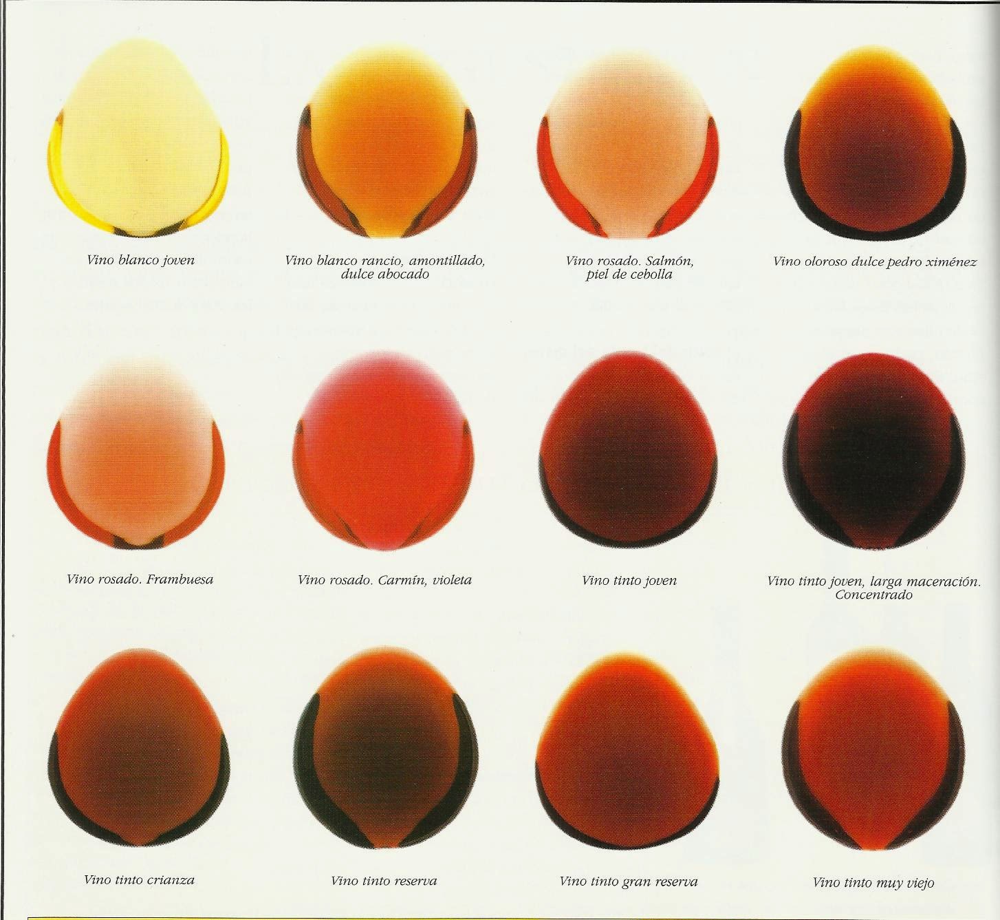 En el caso de los vinos tintos, los colores extremos son diferenciables en función de su tonalidad, pero en los colores intermedios hay que tener en cuenta la saturación del color. La serie que obtenemos, entonces, va además desde vinos con tonalidades violáceas hasta los más teja. Se suele distinguir entre:Rojo violáceo, granate, cereza, rubí, teja y marrón.