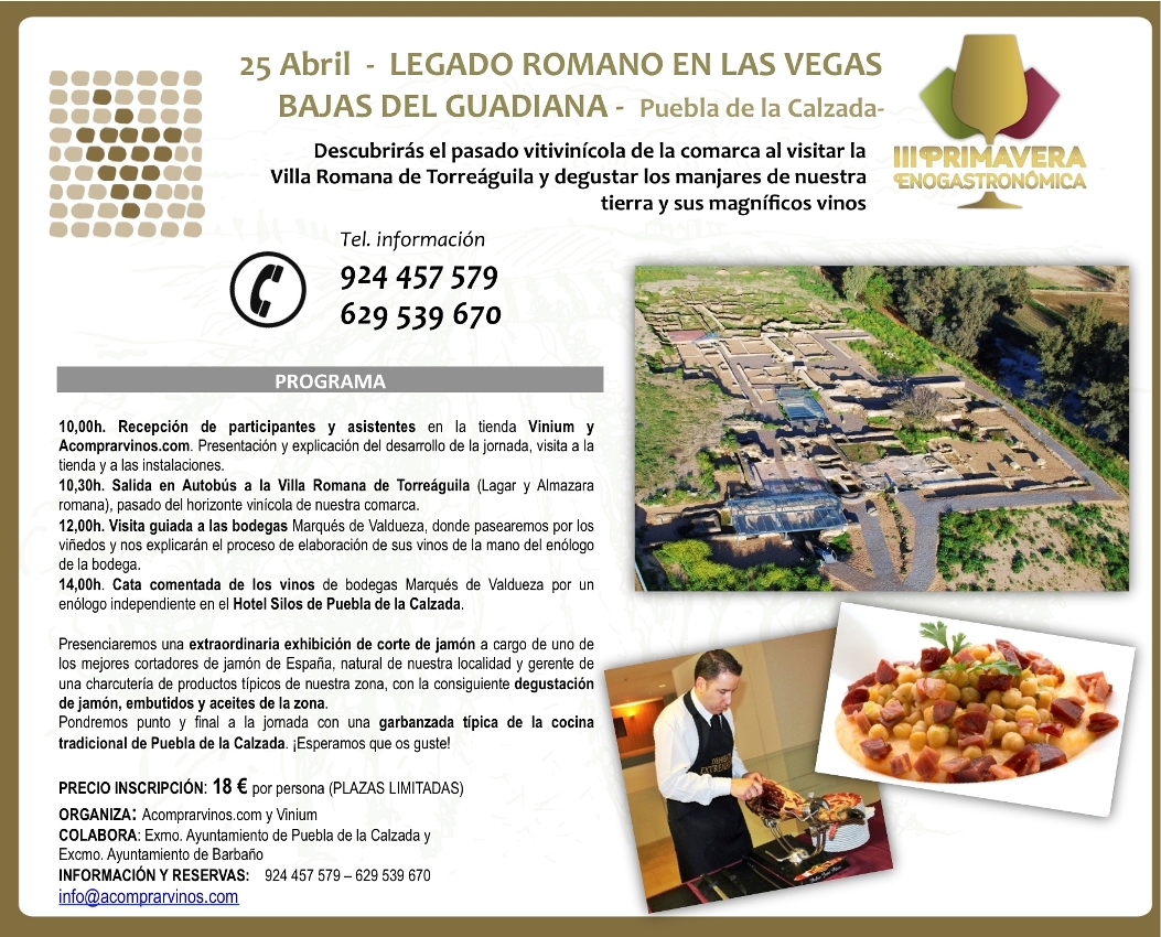 A las 10:00 horas los interesados en la historia de la cultura vitivinícola están citados en la tienda Vinium y Acomprarvinos.com, donde se les presentará la jornada y su desarrollo. Media hora más tarde el autobús saldrá hacia la Villa Romana de Torreáguila, en la que se podrá caminar por el pasado. Los asistentes visitarán un lagar o una almazara con el fin de hacerse una idea de cómo eran utilizados por los romanos.
