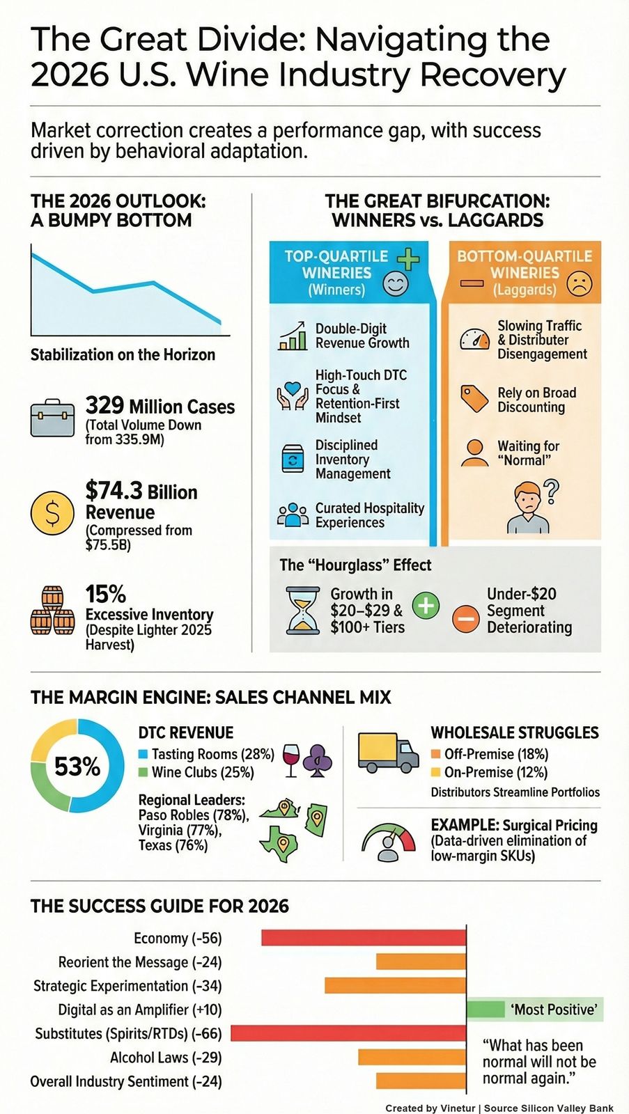 表现出色的酒庄往往规模较小,采取积极主动的管理策略。它们注重品酒室和葡萄酒俱乐部等直接面向消费者(DTC)的渠道,完善产品种类,严格管理库存,并投资于建立客户忠诚度的接待体验。相比之下,表现较差的酒庄更依赖传统批发渠道,战略调整较少。