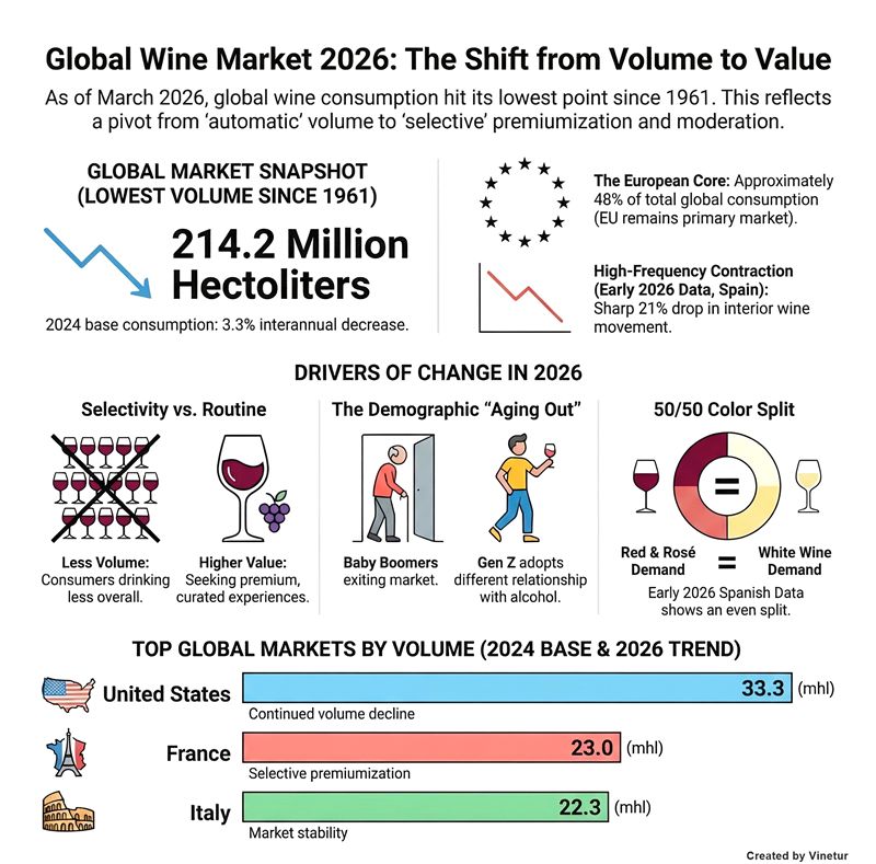 由于国际统计数据的滞后性,2026 年的全球葡萄酒消费量仍然难以实时衡量。国际葡萄与葡萄酒组织(OIV)指出,官方数据整合通常需要三年左右的时间,因此截至 2026 年 3 月初,只能提供部分指标和明确的估计值。最可靠的参考点仍然是2024年,当时全球葡萄酒消费量估计为2.142亿百升(mhl),同比下降3.3%,是1961年以来的最低水平。欧盟的消费量为 1.036 亿百升,约占全球总量的 48%,也比上一年下降了 2.8%。