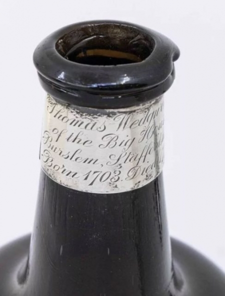 The bottle's collar gracefully states, "Thomas Wedgwood of the Big House, Burslem, Staffordshire. Born 1703. Died 1776." Such a personal inscription provides a direct bridge to the late 18th century and the thriving era of the Staffordshire Potteries. The message is not only an acknowledgment of Thomas's life span but also a testament to his substantial influence and prominence in the pottery realm.