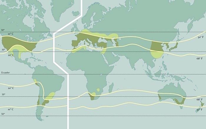 The major wine regions lie within two broad belts known as the Earth's Temperate Zones.