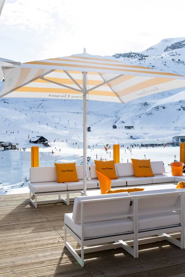 The Boutique Sarrios by Veuve Clicquot terrace, nestled in the Izas valley and accessible on foot or by skis, breaks away from traditional settings. This elegant and sophisticated space is designed for those who cherish exclusivity in an unparalleled environment. Characterized by the brand's iconic color and festive spirit, this terrace is an ideal choice for ski enthusiasts.