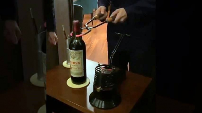 Opening a $15,000 bottle of 1961 Pétrus using the "Portuguese method" at enotecapinchiorri in Florence.