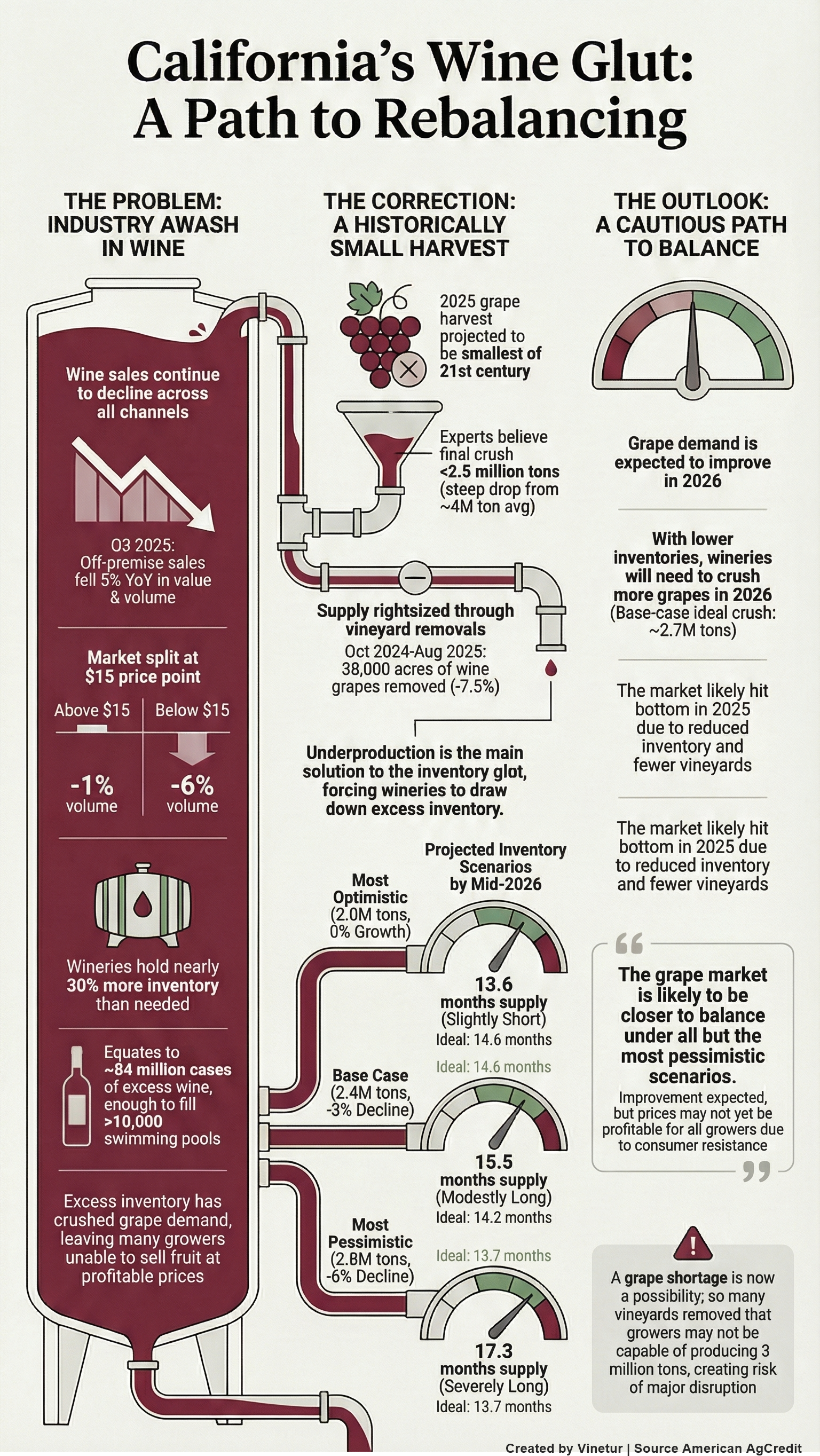 For grape growers, the outlook is mixed. While demand for grapes should improve as inventories shrink, continued vineyard removals mean there will be less capacity to produce grapes next year. Some analysts warn that if demand rebounds faster than expected or if yields are disrupted by weather or disease, shortages could emerge as soon as next year.