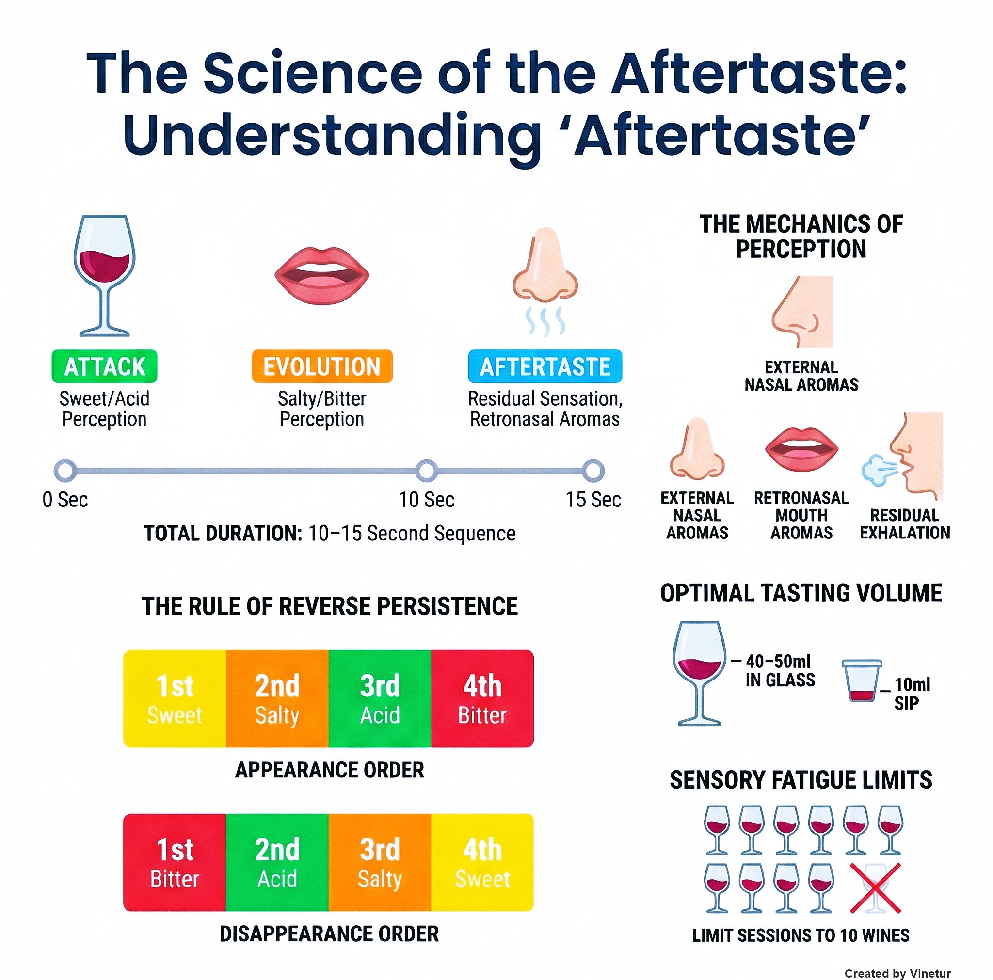 The overall flavor of wine results from a combination of taste, smell, and touch. This process occurs in three stages: external nasal aroma perception while sipping; in-mouth perception where retronasal olfaction releases additional aromas; and finally, the aftertaste experienced upon exhaling after swallowing when residual sensations persist in the mouth, nose, and throat.