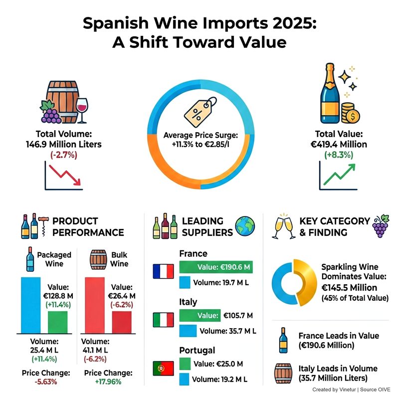 The OIVE report suggests that Spanish importers are moving away from bulk commodity wines toward finished products ready for retail and hospitality channels. The decline in bulk imports signals that low-cost processing models are losing viability under current market conditions.