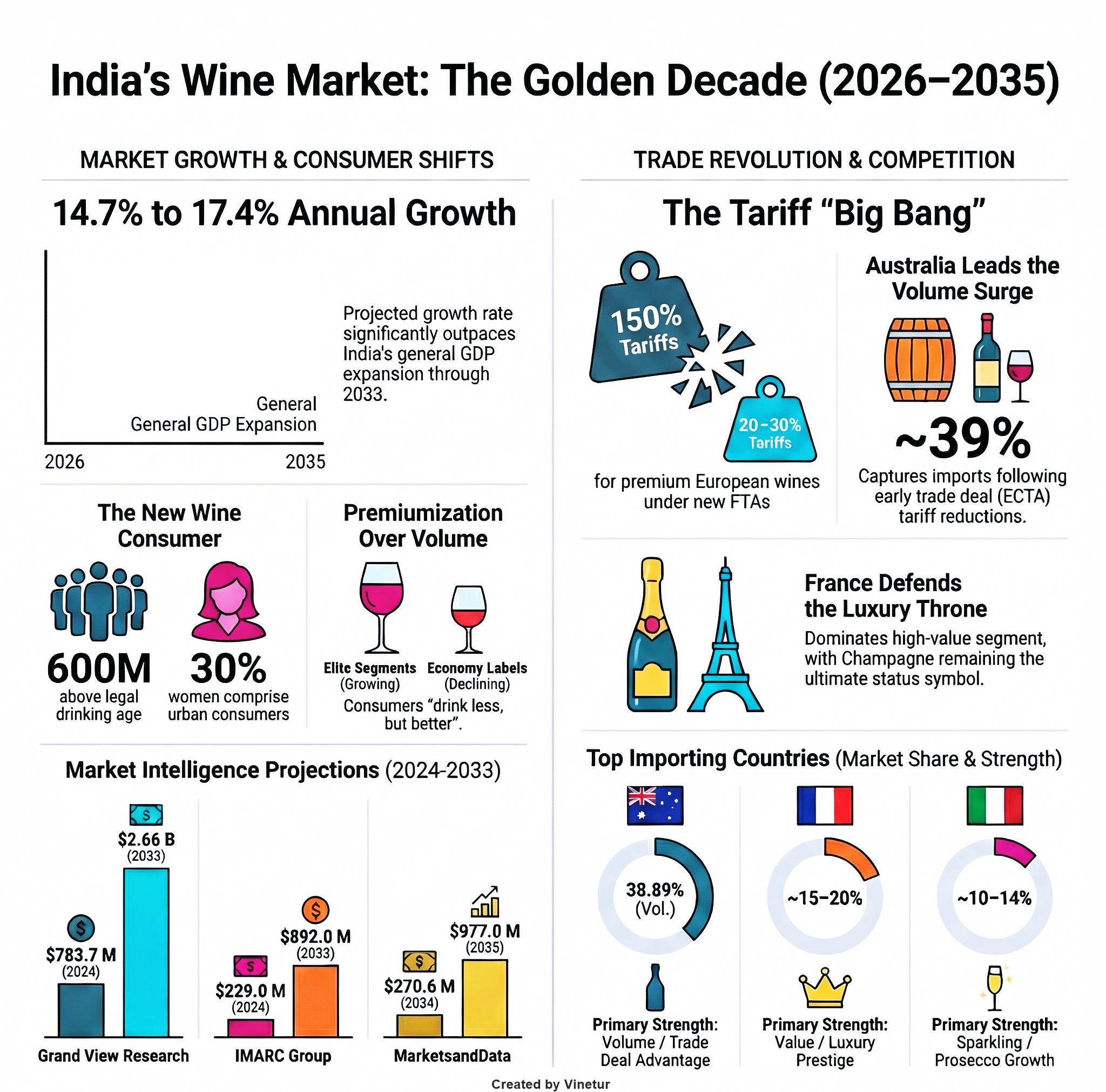 India’s wine market is entering what analysts call a “Golden Decade.” While wine consumption in Europe and the United States is stagnating or declining, India is projected to grow at a compound annual rate between 14.7% and 17.41% through 2033. Market valuations vary depending on methodology, but estimates for 2024 range from $229 million to $783.7 million, with projections reaching as high as $2.66 billion by 2033.