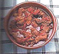 Macerar el conejo la víspera cortándolo a trozos y poniéndolo en una cazuela con una cebolla cortada en trozos, los dientes de ajo pelados, un litro de vino blanco, un chorro de vinagre y sal.