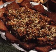 En un mortero se machacan las almendras juntamente con el azafrán y se añade este majado a la cazuela. Una vez sofrita la gallina, se van sacando los trozos y se incorporan a la cazuela. En el aceite de sofreir la gallina, se doran la cebolla y el ajo picados. Cuando estén dorados, se le añaden dos cucharadas de harina, se remueve bien fuera del fuego y se echa todo en la cazuela.