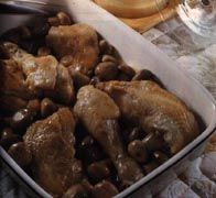En una cazuela amplia dorar los muslitos y una vez dorados sacarlos a una fuente. En ese aceite sofreir a fuego muy suave la cebolla, el puerro y la zanahoria muy picaditos y sazonar con sal. Cuando la verdura esté suave, colocar encima los muslitos, verter el vino tinto, tapar la cazuela herméticamente y dejar hacer hasta que los muslitos estén tiernos y la salsa trabada.