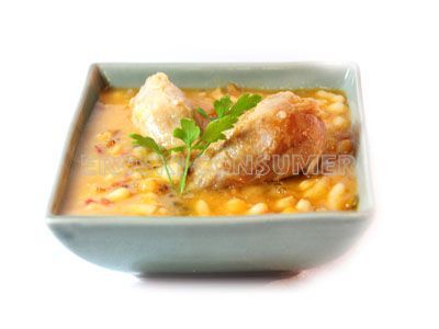 Cuando falte media hora para terminar de hacerse las alubias, agregamos el estofado de pollo a las alubias y dejamos que se cocine todo el conjunto por espacio de 30 minutos Una vez cocinadas las alubias y antes de servir, vertemos sobre la cazuela un refrito de ajos cortados en rodajitas y una cucharada de pimentón dulce.