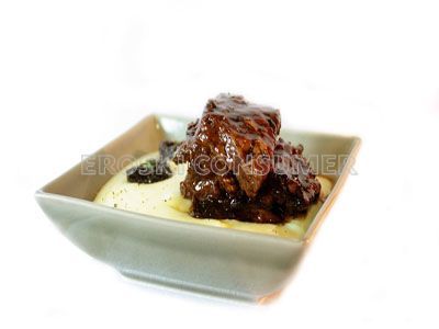 Servimos sobre la crema de patata los trozos de ternera asada salseadas con los jugos del asado y con las ciruelas asadas.
