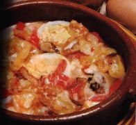 Se cortan los huevos duros en rodajas. En una cazuela de barro, se alternan con los pimientos morrones cortados a tiras.