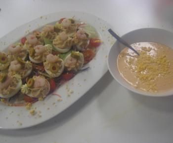 Elaboración de Huevos rellenos con gambas y atúnEn una cacerola de tamaño adecuado poner los huevos con cuidado, cubrirlos de agua y añadir un puñado de sal. De esta manera se facilita el pelado. Una vez así prepararlos llevarlos al fuego y cuando el agua comience a hervir contar diez minutos. Retirar del fuego, refrescar con agua fría y pelar. Partir por la mitad a lo largo y sacar las yemas. Reservar, si se quiere, un poco de yema picada y el resto mezclarla con la cebolla en polvo, el bonito en aceite bien escurrido y desmenuzado, las gambas bien picadas, un poco de sal y unas cucharadas de mayonesa hasta formar una pasta homogénea. Rellenar los medios huevos con esta mezcla y cubrir con un poco de mayonesa aligerada con una pizca de leche o yogur. Adornar con las yemas picadas reservadas y colocar sobre un lecho de ensalada. Si se desea se puede poner en salsera aparte más mayonesa, salsa cóctel, rosa u otra derivada de la mayonesa.