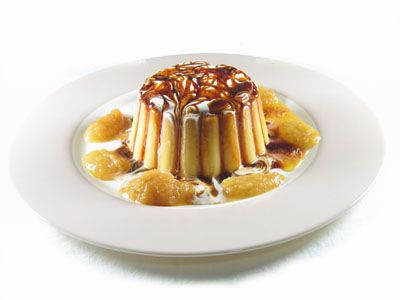 Acompañamos de nata con azucar semi montada en la parte superior del flan desmoldado y de unos montoncitos de compota de manzana alrededor del flan.