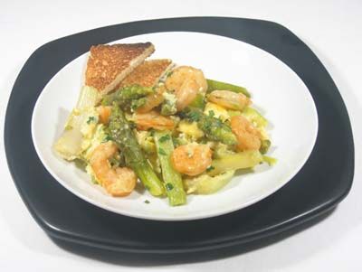 El huevo, fuente de proteínas de alto valor biológico y rico en algunas vitaminas aunque también en grasas y colesterol, es el elemento protagonista de todos los revueltos. En este caso, el huevo está acompañado de verduras, ricas en vitaminas y minerales y con un bajo contenido graso; y de gambas, que aunque poseen un contenido en colesterol algo elevado, son alimentos que no se consumen frecuentemente y que además se emplean en cantidades pequeñas como acompañamiento de algunos platos.
