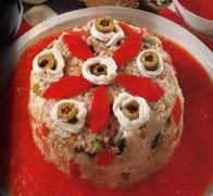 Colocar la mezcla en un molde redondo apretando bien para aplanarlo. Dar la vuelta al molde sobre una fuente redonda. (Del mismo modo que se vuelve una tortilla con la ayuda de un plato). Decorarlo con las rodajitas de aceitunas rodeadas con un poco de salsa mayonesa y con el pimiento morrón a modo de radios y formando una estrella.