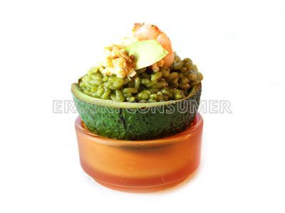 Vaciamos dos mitades de aguacate y troceamos el interior de los aguacates. Mezclamos el arroz con las gambas, los aguacates y con ello rellenamos los aguacates que servimos templados.
