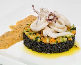 Trocea el calamar en aros finos, sazona y saltéalo en una sartén con un poco de aceite. Sirve en un molde el arroz y pon encima la verdura. Desmonta el molde y coloca los aros de calamar encima de la verdura. Salsea con la salsa de tomate.