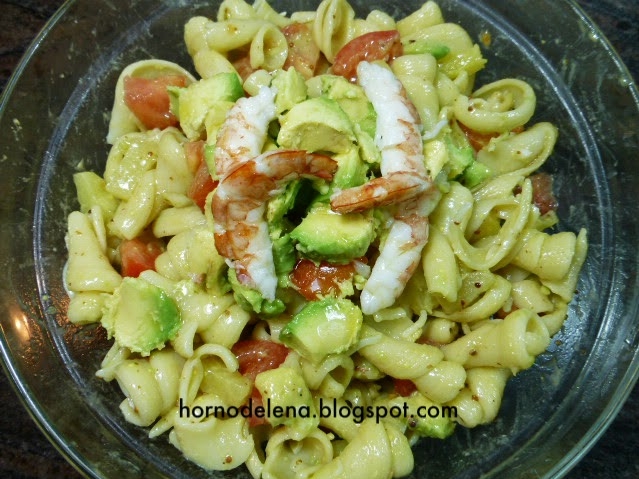 Añadimos a la pasta el medio aguacate (reservamos la otra mitad para decorar), la piña, el tomate y los langostinos (reservamos 2 para decorar)