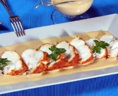 Limpiar las hojas de lechuga, escurrirlas y cortarlas en juliana fina. Colocarlas en el fondo de la bandeja, disponer las rodajas de rape y servir la salsa rosa a ambos lados del rape.