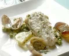 Añadir los guisantes y cocinar 8 minutos más . Salpimentar el rape, y dorarlo un poco en la sartén con 1 diente de ajo con la piel.
