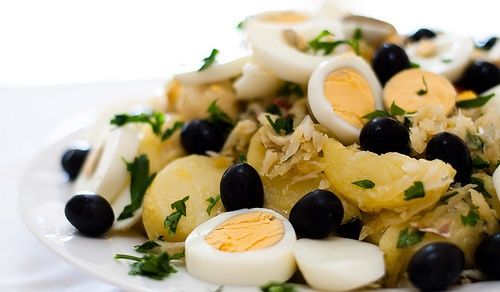 5. Se sirve en la misma fuente y muy caliente con aceitunas negras grandes, perejil picado y rodajas de huevo cocido
