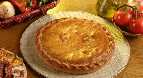 Se extiende la mitad de la masa y se coloca en una lata o directanmente sobre la placa de horno untada con grasa del refrito. Sobre ella se distribuye el relleno. Colocamos encima la otra lámina de masa, cerramos los bordes y dejamos un agujero en el centro para que respire. La metemos en el horno durante, aproximadamente, media hora hasta que esté dorada. Antes de retirarla se pinta con un poco de grasa del rustrido. (La masa debe de quedar lo más fina posible).