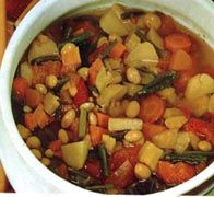 Dejar en remojo las judías blancas la víspera. Pelar las verduras, salvo las patatas y trocearlas en dados pequeños. Sofreir en una sartén la cebolla y los ajos bien picaditos. Agregar las verduras y rehogar a fuego lento sin que lleguen a dorarse.