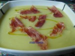 Si está espesa es el momento de añadir caldo del cazo hasta conseguir una crema suave. Ahora el toque del jamón serrano. Este toque se lo vi a Mari en su blog www.recetariodemari.com y me pareció interesante. Gracias Mari desde aqui, me ha encantado. Pues yo lo he hecho así: troceamos las lonchas de jamón serrano, ponemos una sartén a calentar sin nada de aceite, y ponemos el jamón para que se tueste, damos la vuelta, e inmediatamente servimos en cada plato unos trocitos. Ponemos un chorrito de aceite crudo.