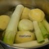 los cortamos por la mitad y a la olla. Ahora ponemos también las patatas peladas y cortadas a la mitad y la cebolla pelada y entera.