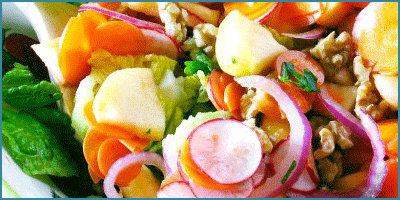 Sobre las patatas colocaremos las hojas de lechuga roja cortada en juliana, las hojas de albahaca picadas, la chalota en rodajas, y el huevo y la manzana, también picados.