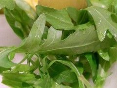 La rúcula también es una alternativa como acompañamiento en ensalada de pescados ahumados o en salazón, como unas láminas de bacalao o unos trocitos de salmón ahumado con unos piñones tostados, unos gajos de naranja y aliñados con una vinagreta elaborada con aceite de oliva suave y vinagre de frambuesa. Es una ensalada refrescante y vibrante de texturas variadas.