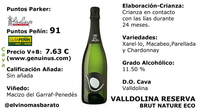 El Cava VallDolina Reserva Eco, de gran relación calidad/precio; está elaborado con Macabeo, Xarel-lo, Parellada y Chardonnay. Tiene una crianza de 24 meses.