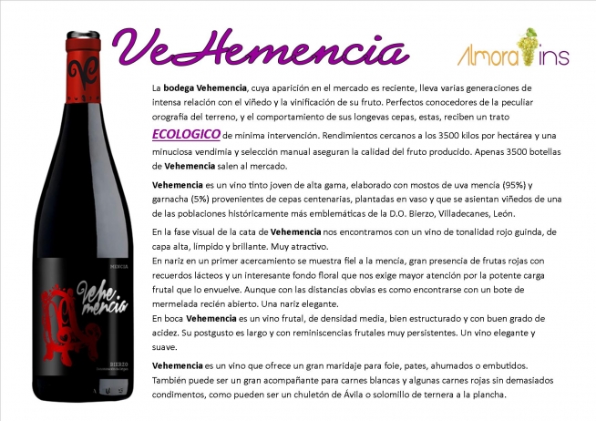 En boca es un vino frutal de densidad media,bien estructurado y con buen grado de acidez.Un vino elegante y suave. Apenas 3500 botellas de Vehemencia salen al mercado.