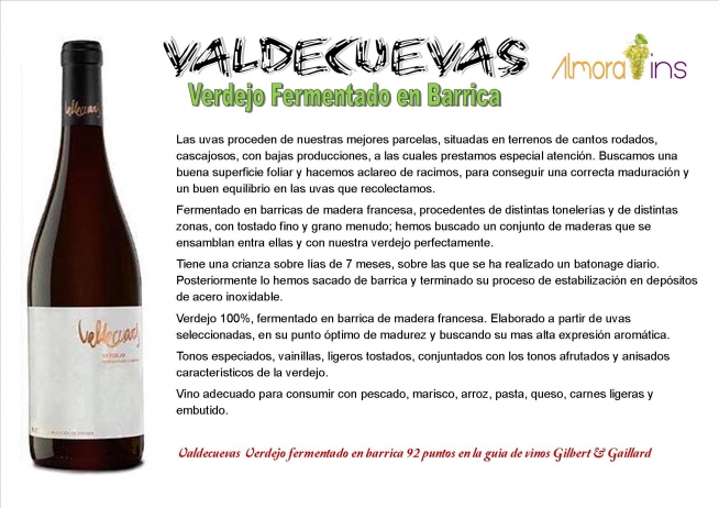 Tonos especiados, vainillas, ligeros tostados, conjuntados con los tonos afrutados y anisados característicos de la verdejo. Vino adecuado para consumir con pescado, marisco, arroz, pasta, queso, carnes ligeras y embutido. Fermentado en barricas de madera francesa, procedentes de distintas