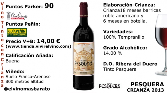 Este vino tinto, Pesquera Crianza 2013, del Grupo Pesquera se elabora con uva 100% Tempranillo y tiene una crianza de 18 meses en Barricas de roble Americano y un posterior afinamiento en botella de 6 meses, antes de su salida al mercado.